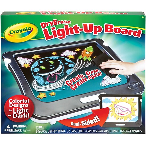 Crayola dry erase light up board lets you create colorful designs on a lighted dual sided board.